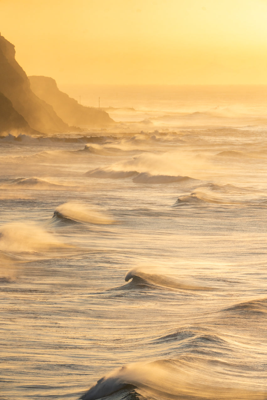 "Peaks" captures the early morning swell at sunrise, stretching from Merewether to Bar Beach. The coastline is alive with numerous peaks forming along the shoreline, each wave catching the soft glow of the unseen sun. The warm light of the rising sun casts a golden hue over the water, creating a tranquil yet dynamic atmosphere. Looking north, the scene embodies the beauty of the coast, with the gentle swell highlighting the fluid energy of the ocean and the coastal landscape.