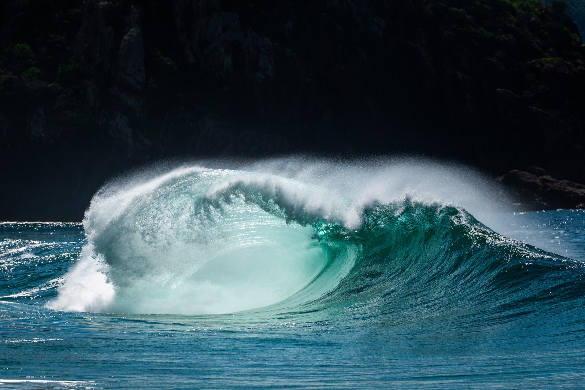 “Unfolding” reveals the fleeting perfection of a blue backwash wave as it folds in on itself to form a hollow barrel. Set against the shadow of a rugged cliff face, the contrast between deep darkness and luminous water creates a dramatic seascape.