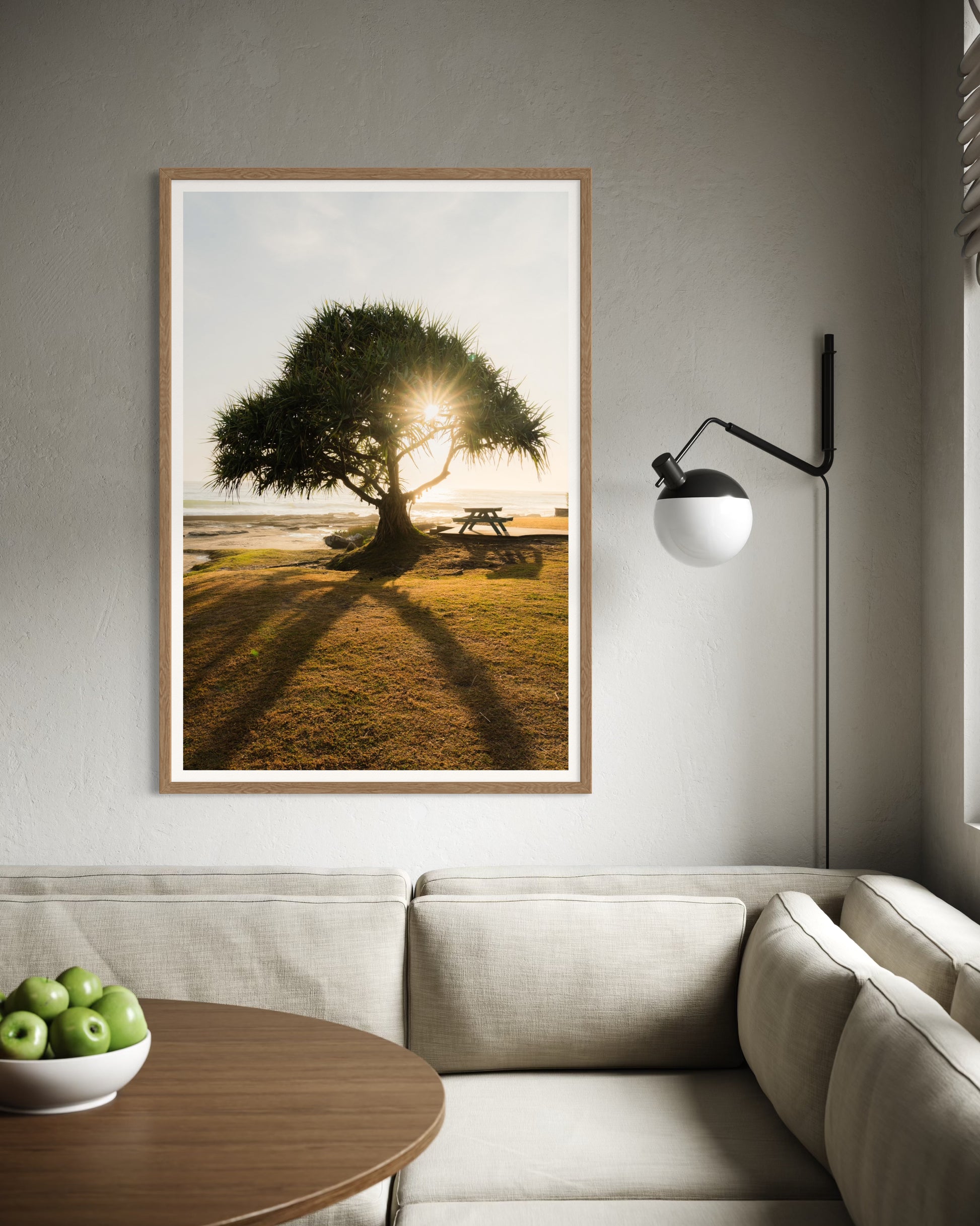 A coastal pandanus tree at Yamba with the early morning sun shining through its branches, casting long shadows across the grass. The scene captures a relaxed Yamba lifestyle, with the beach, picnic table, and shoreline in the background highlighting the area’s laid-back coastal atmosphere.