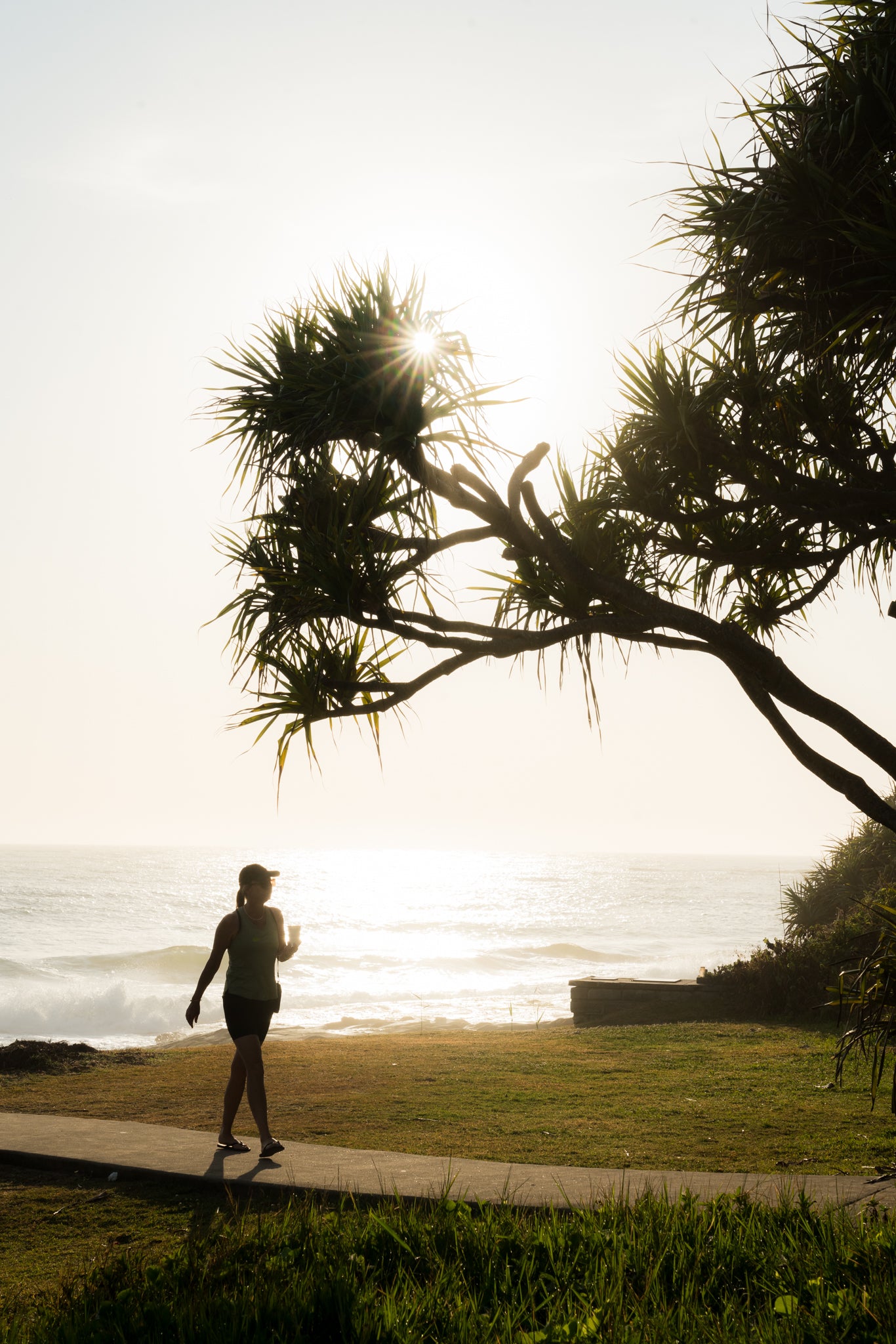 A coastal sunrise scene in Yamba, a popular NSW North Coast town known for its beaches, warm climate, and relaxed community vibe. The image shows a woman walking with a morning coffee from one of Yamba’s many local cafés—more than a dozen operate in the area—along the foreshore path. Framed by a pandanus tree and the glowing ocean horizon, the scene captures a classic Yamba daily ritual and the easy coastal lifestyle the town is known for.