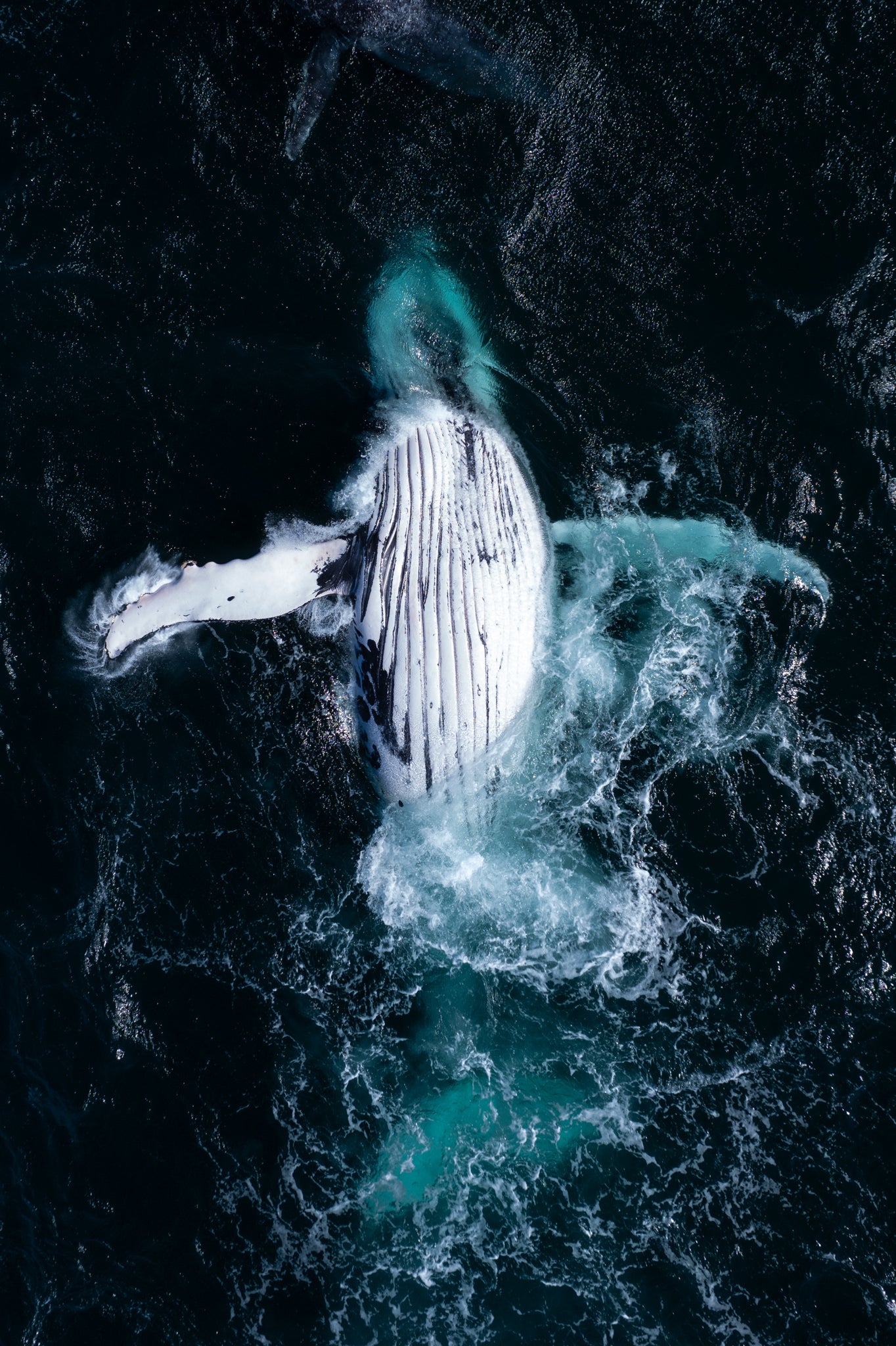 An aerial view of a humpback whale rolling near the ocean surface, its white pectoral fin and belly pleats clearly visible through the dark blue water. This image captures part of the annual humpback migration, when thousands of whales pass along Australia’s east coast in September as they return south toward Antarctica after calving in warmer northern waters. The shot highlights the power and movement of these whales during one of the world’s largest and most predictable marine migrations.