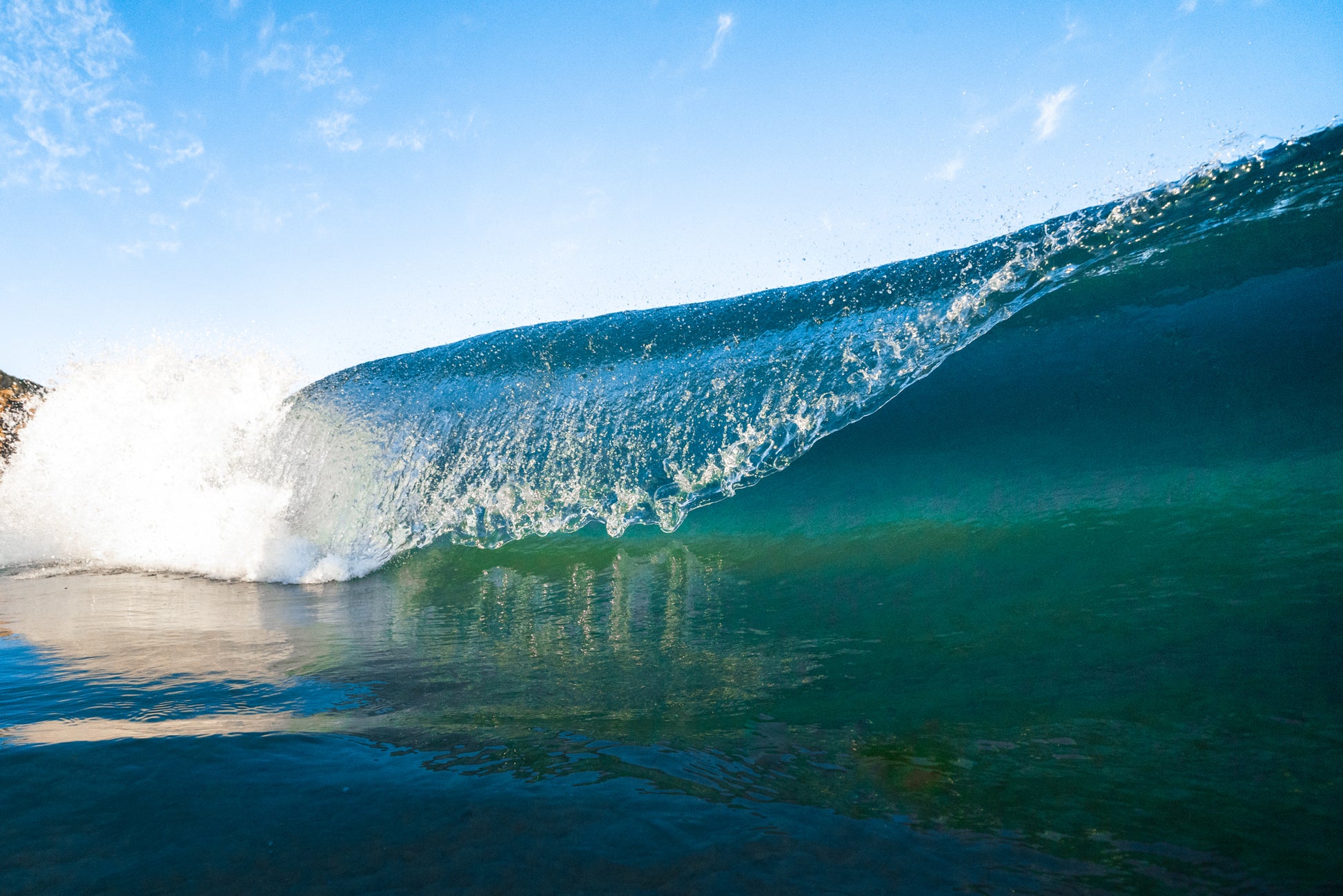 This image captures the delicate beauty of a small wave breaking with an incredibly smooth, glass-like surface, resembling the texture of milk.