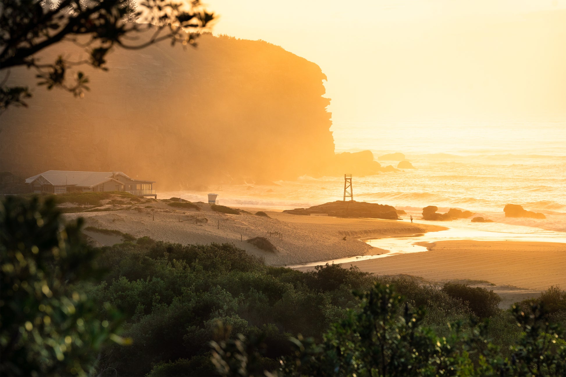 "Redhead Seaspray" offers a stunning view of Redhead Beach from the hills above, capturing the iconic Shark Tower, Surf Club, and rugged cliffs in the early morning light. The sky is painted in warm orange hues from the rising sun, casting a golden glow over the coastline and shimmering waters below. The tranquil scene highlights the beauty of Newcastle’s coastline, with the combination of land, sea, and sky creating a peaceful yet vibrant atmosphere. A perfect representation of Redhead Beach at sunrise, full of natural charm and coastal energy.